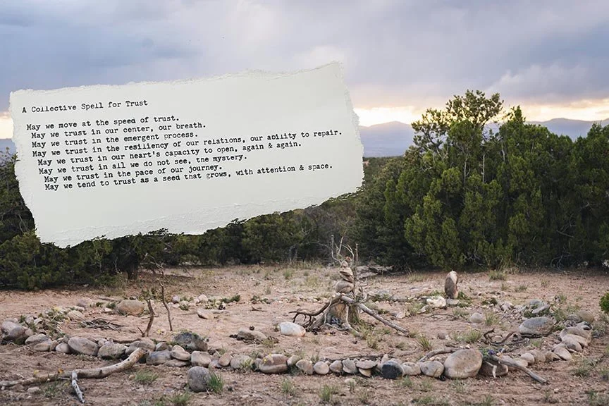 By invitation of performance artist Billie Secular the following spell was created and enacted on June 21st, 2023 embodying the word trust. The process of creating this piece engaged in social-research asking What does the word trust mean to you? What is your experience of it? How do you know you trust? With permission from the land, community participants were invited to co-create a land-based structure on the day of the event.