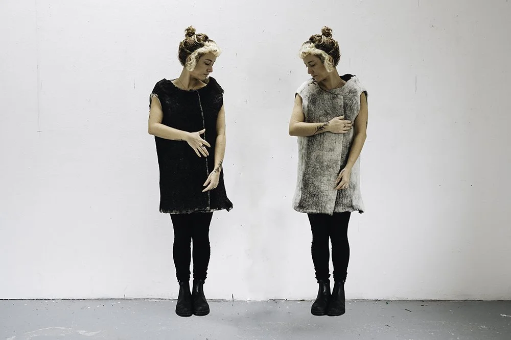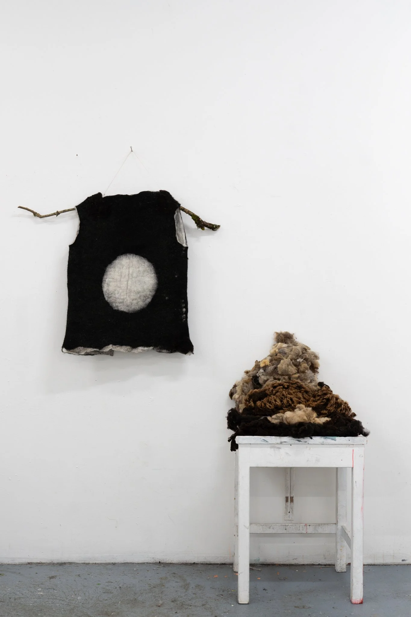 This piece was created in response to a practice of lichenizing pedagogy. Sympoiesis considers ways in which different organisms and species come together in a process of living and making. Through their interactions, meaning is co-created. My human body served as one organism, wool the other. This piece is reversible in nature, containing multitudes. The circle allows both binary colors, black and white, to be visible. This fabric adornment was created with local wool donated by Burren farmers. An ancestral art form, wet felting was engaged as a binding material.
